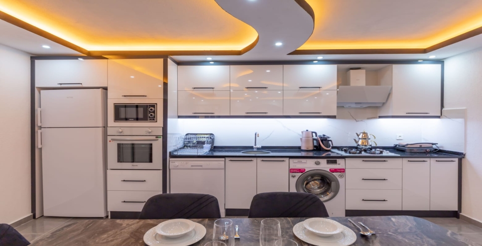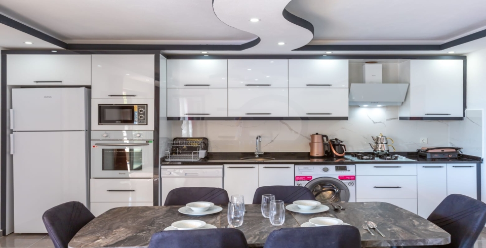 Mutfak : Modern Amerika mutfağımızda 4 kişilik yemek masası, buzdolabı, çamaşır makinesi, mikrodalga fırın, 4’lü ocak, tost makinesi, elektrikli su ısıtıcısı, çatal-bıçak takımı, tencere-tava takımı, bulaşık makinesi bulunmaktadır.