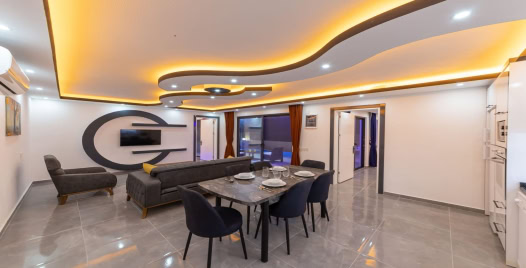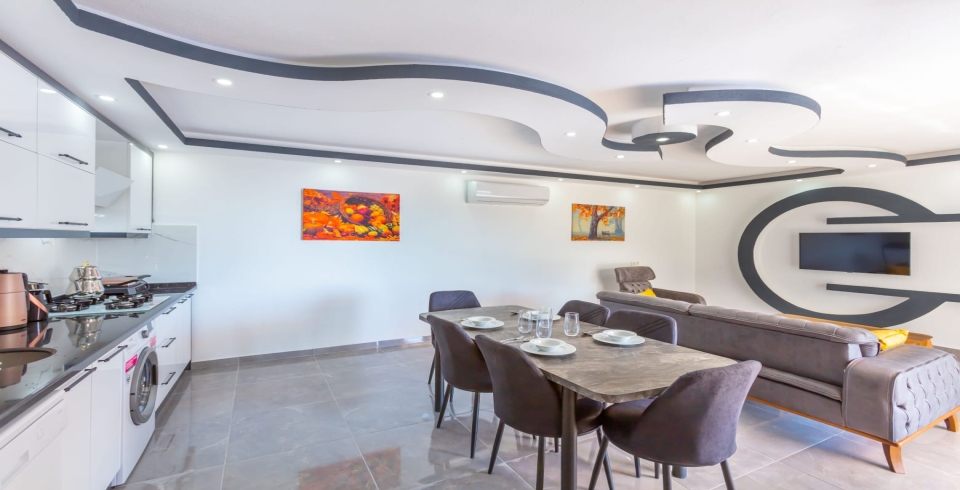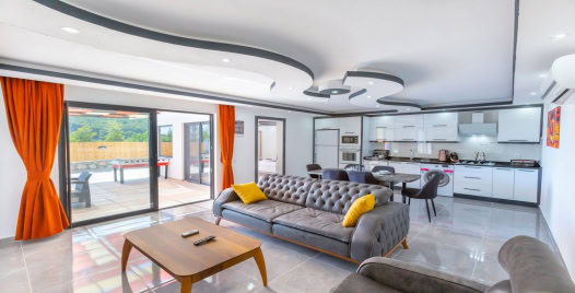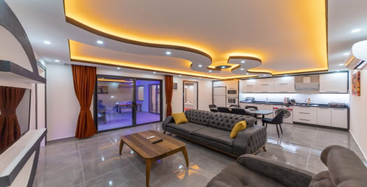 Salon : Villamızın iç dizaynı da son modaya uygun olarak modern bir şekilde tasarlanmıştır. Çeşitli dekoratif eşyalarla süslediğimiz salonumuz havuzlu bahçeye açılıyor. Villa salonunda oturma grubu, TV, internet, klima, yemek masası, sehpa bulunmaktadır.