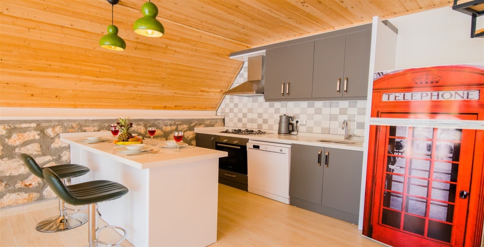 Mutfak :Villamızın geniş Amerikan mutfağı ile sizlere kendi evinizin mutfağı gibi hissettirecek. Ayrıca mutfakta klima, bulaşık makinası, buzdolabı, çamaşır makinası, mikrodalga fırın, tost makinası, ekmek kızartma, su ısıtıcısı, fırın, 4`lü ocak seti ve 4 kişilik yemek masası ile tava tencere vb. mutfak araç gereçlerini kullanma fırsatını sizlere sunuyoruz.