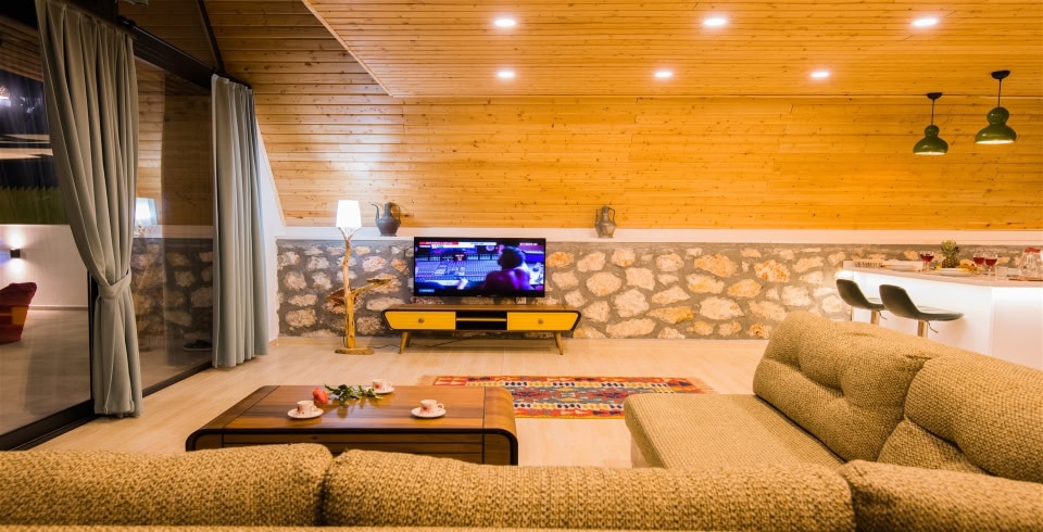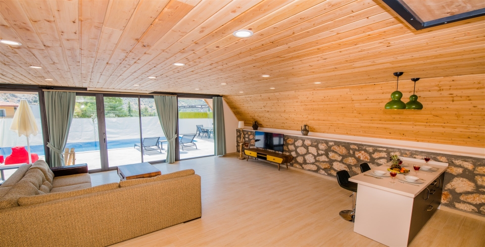 Salon : Villa Bolivya’nın salonunda sizi şık bir oturma grubu ile klima, televizyon, internet, uydu, koltuk, sehpa ile ferah bir salon bekliyor olacaktır. Havuz terasına çıkış yapılmaktadır.