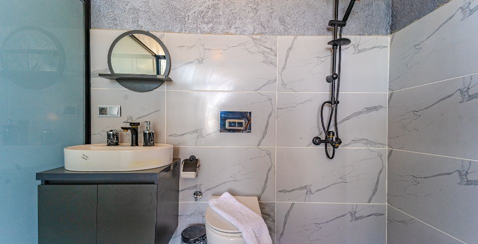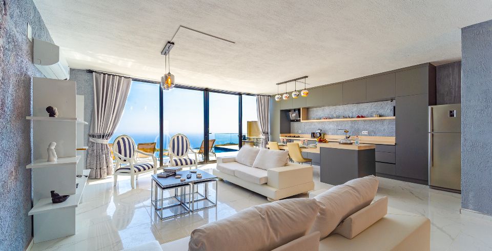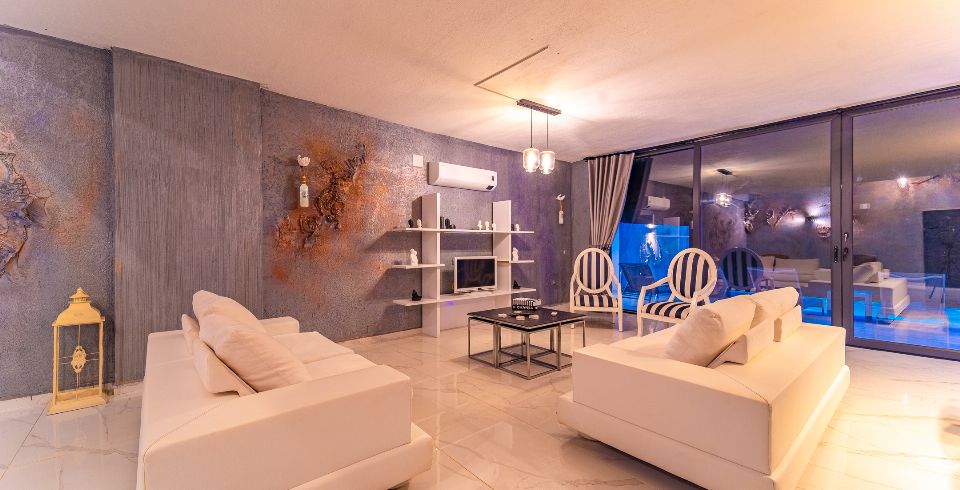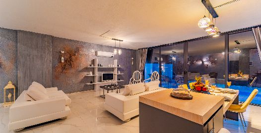 Salon : Salon içerisinde oturma grubu, TV, klima, sehpa bulunmaktadır. Havuz terasına çıkış yapılabilmektedir.