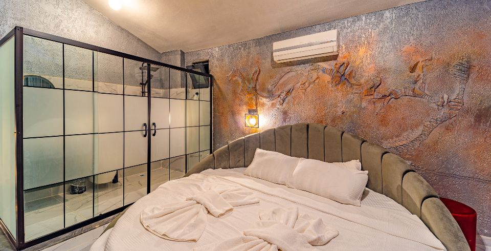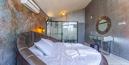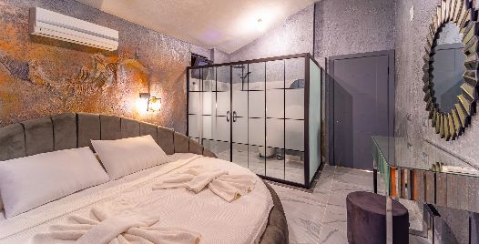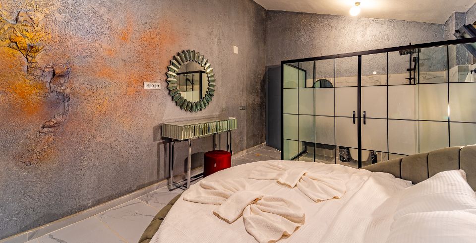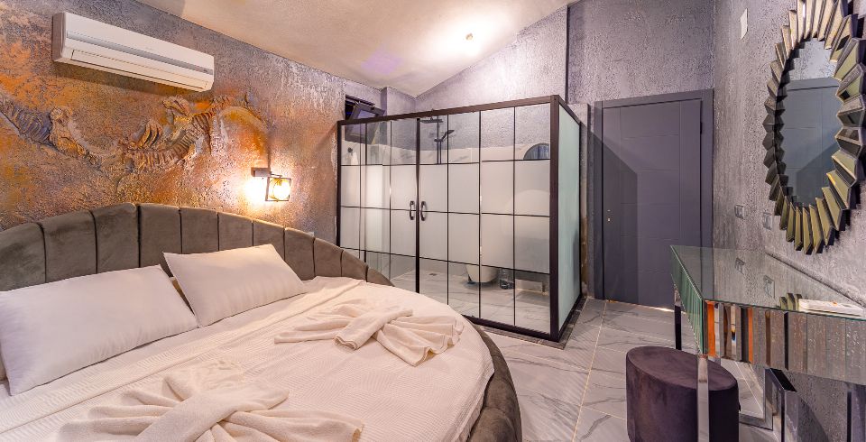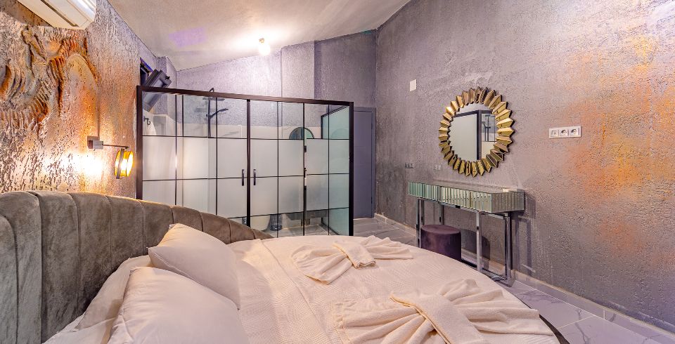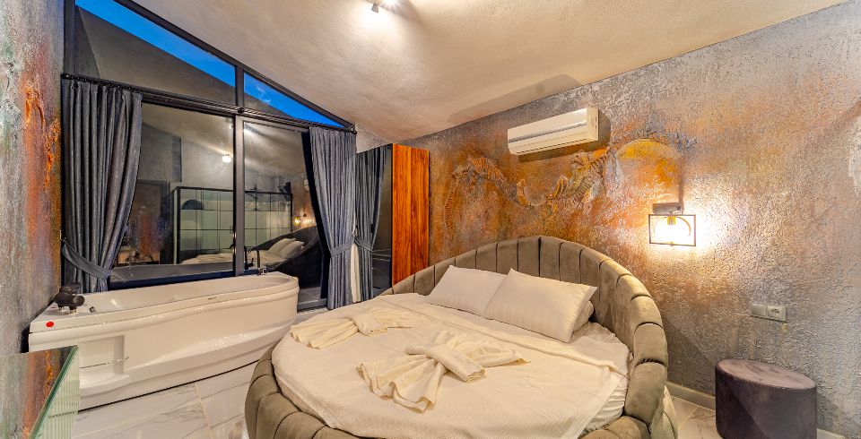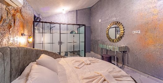 1. Yatak Odası : 1 adet çift kişilik yatak, klima, komodin, elbise dolabı, jakuzili havuz, banyo ve tuvalet bulunmaktadır.