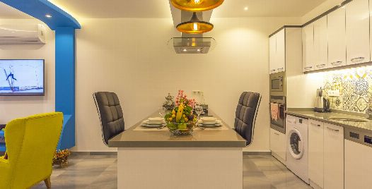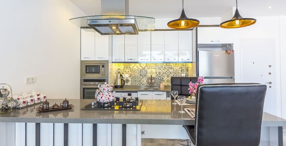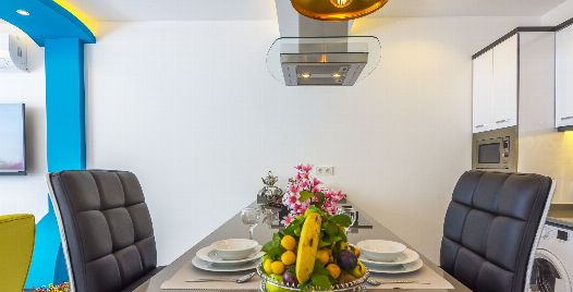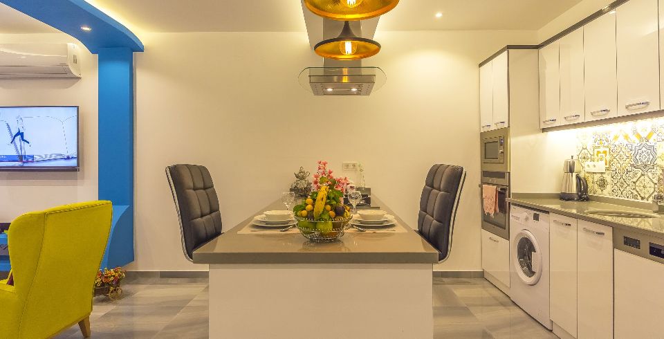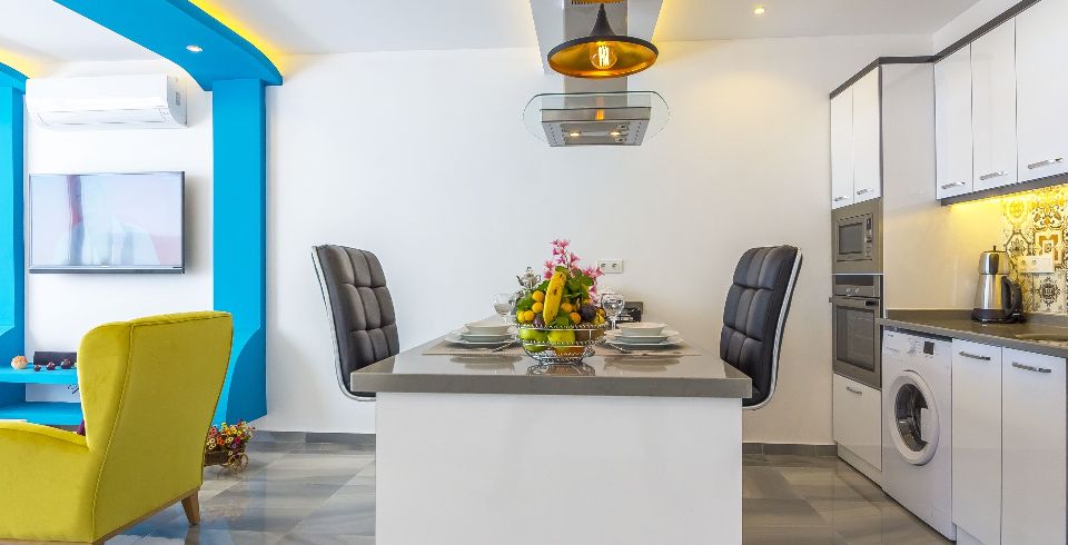 Mutfak : Deniz manzarasına karşı yemekler yapabileceğiniz mutfağımızda buzdolabı, bulaşık makinesi, çamaşır makinesi, fırın, ankastre ocak, mikrodalga fırın ve çeşitli mutfak araç-gereçleri bulunmaktadır.