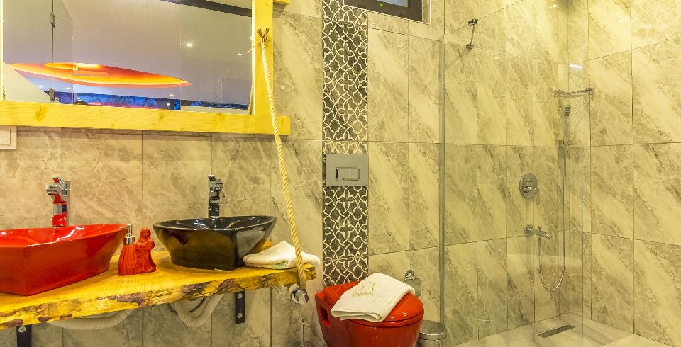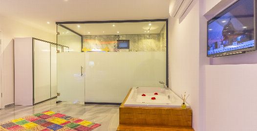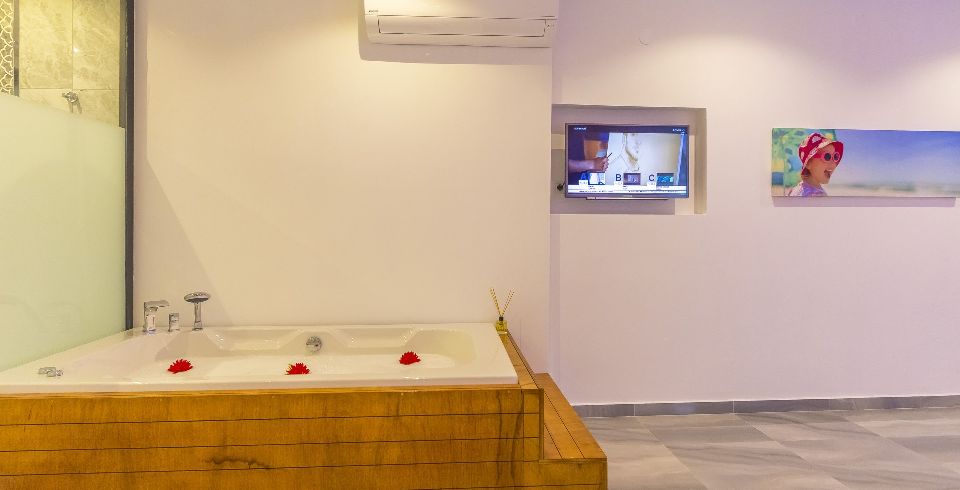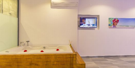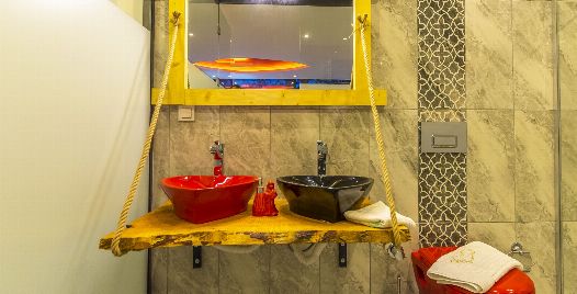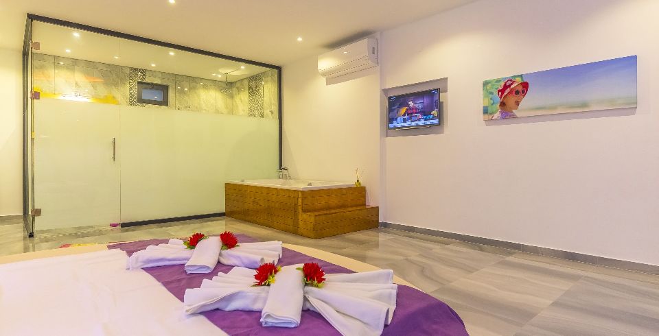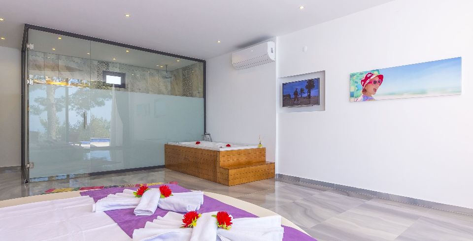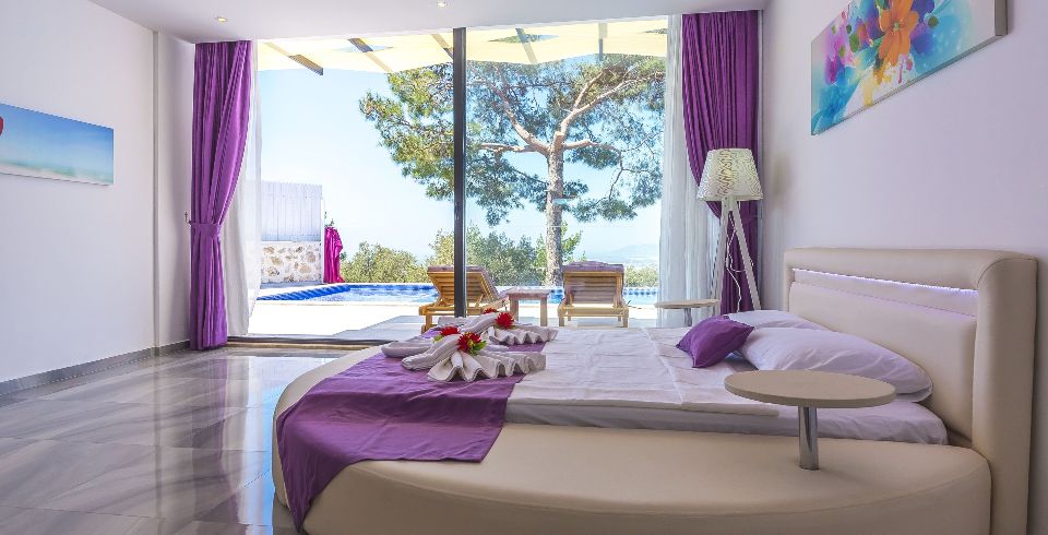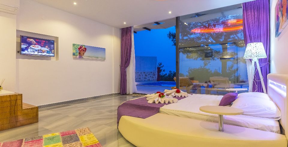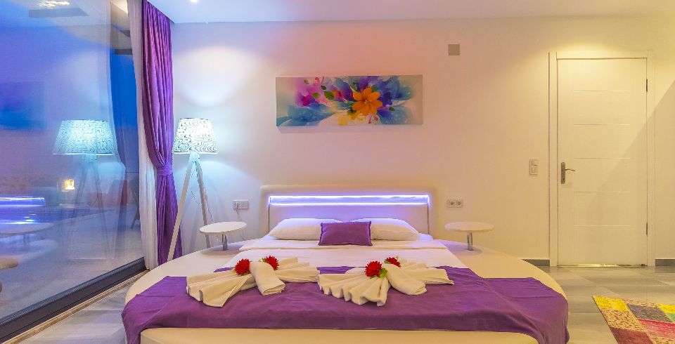 Yatak Odası : İçerisinde özel kapalı ısıtmalı havuzu bulunan çift kişilik süit odamızda klima, elbise dolabı, makyaj masası, komodin, banyo ve lavabo bulunmaktadır.