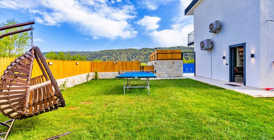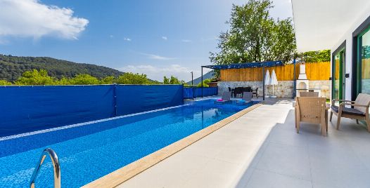 Bahçe : Villamızın bahçesinde özel yüzme havuzu, güneşlenmeniz için adet şezlong, güneşlenme terası, 6 kişilik masa, oturma grubu, mangal keyfiniz için barbekü, güneş şemsiyesi bulunmaktadır.
