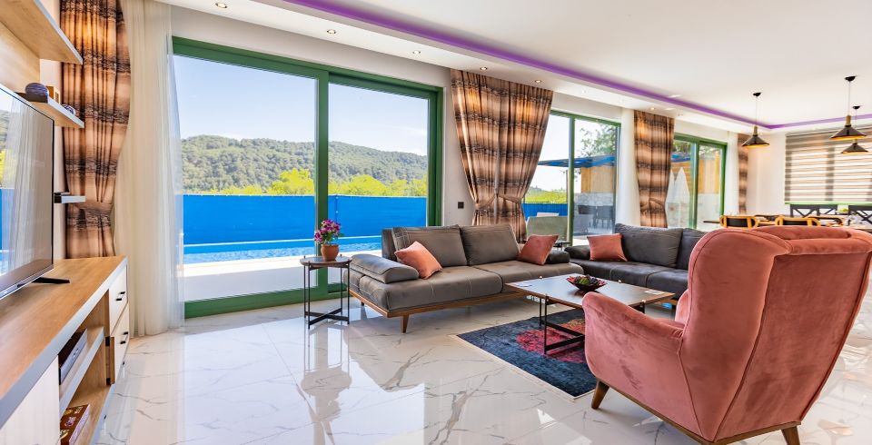 Salon : Villamızın salonunda sizi şık bir oturma grubu ile klima, televizyon, internet, uydu, koltuk, sehpa ile ferah bir salon bekliyor olacaktır. Havuz terasına çıkış yapılmaktadır.