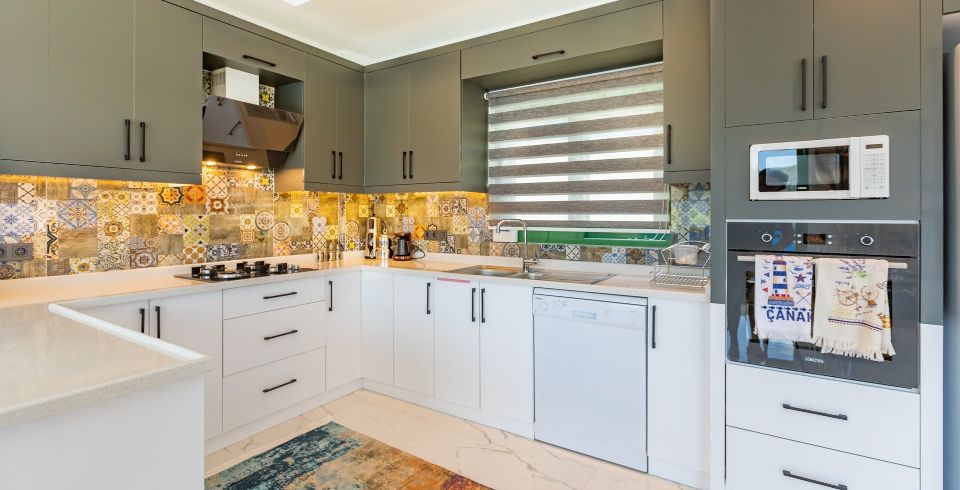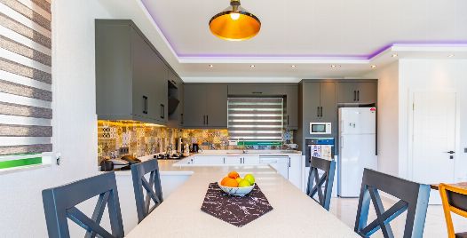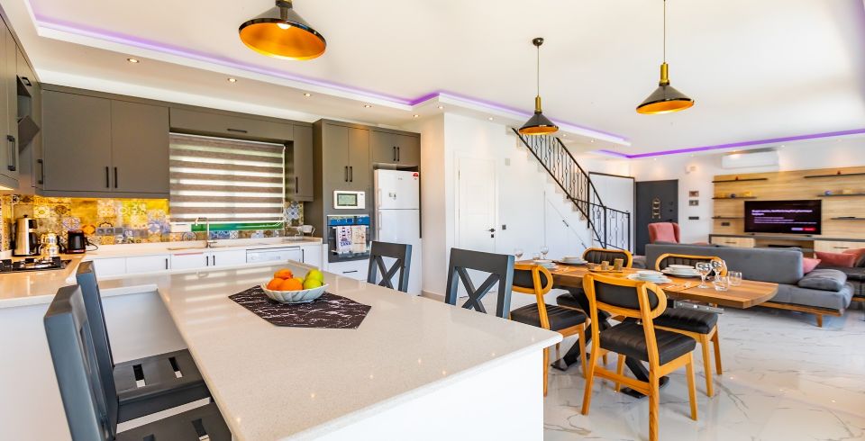 Mutfak : Villamızın geniş Amerikan mutfağı ile sizlere kendi evinizin mutfağı gibi hissettirecek. Ayrıca mutfakta klima, bulaşık makinası, buzdolabı, çamaşır makinası, mikrodalga fırın, tost makinası, su ısıtıcısı, fırın, 4`lü ocak seti ve 4 kişilik geniş yemek masası ile tava tencere vb. mutfak araç gereçlerini kullanma fırsatını sizlere sunuyoruz.