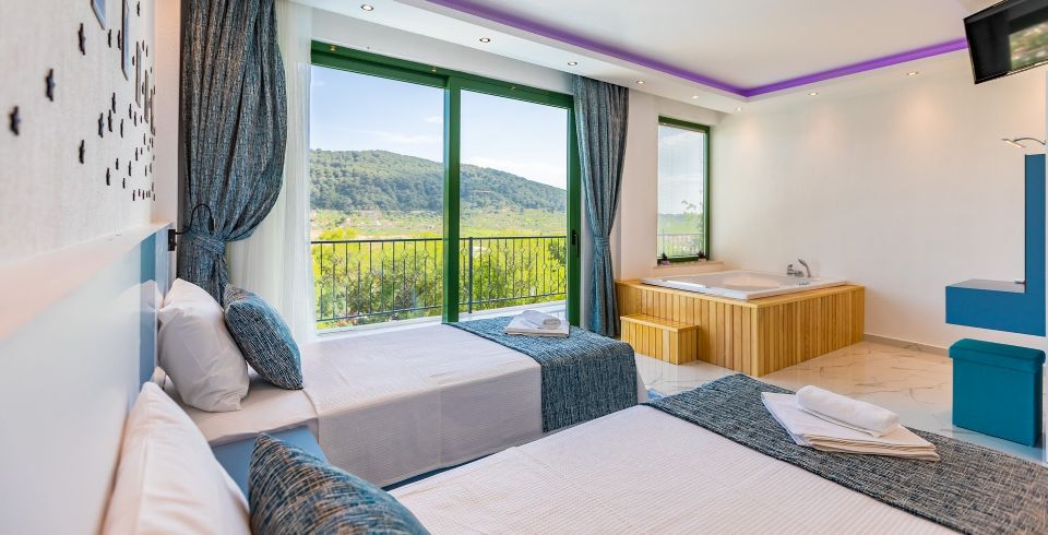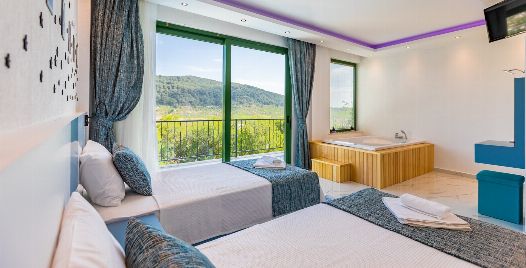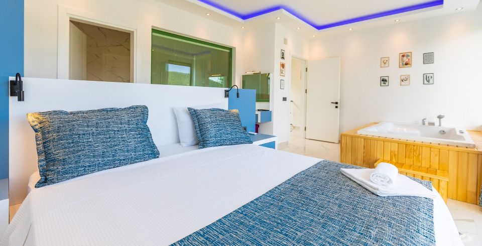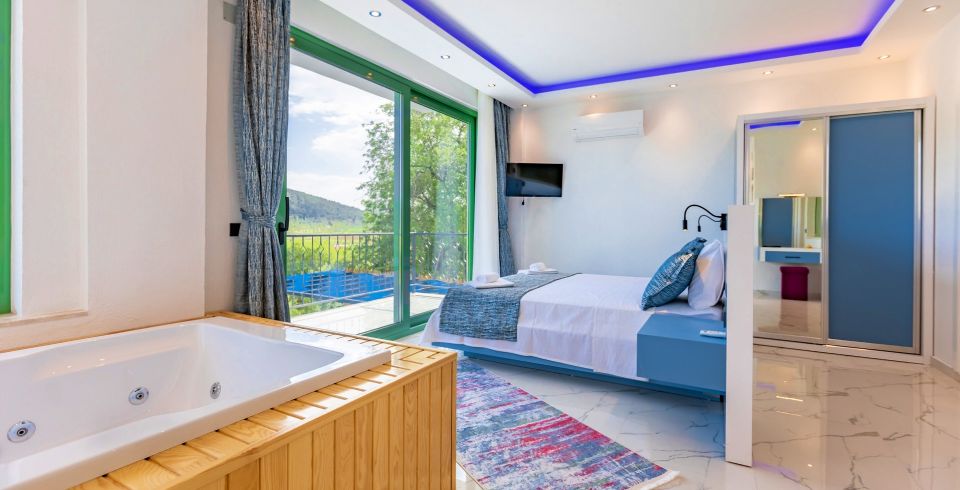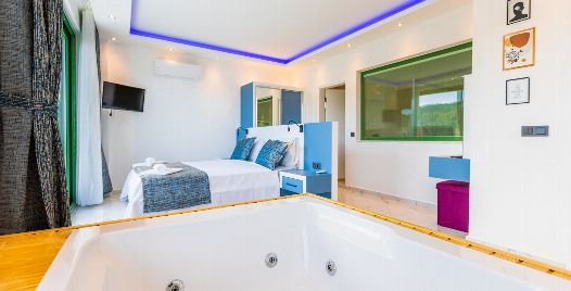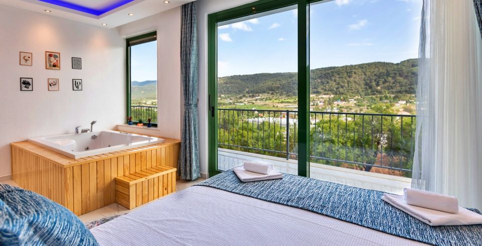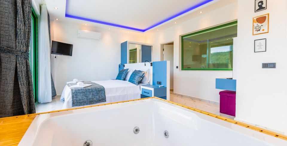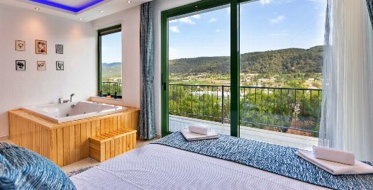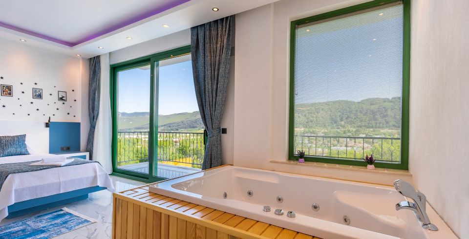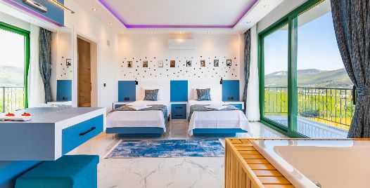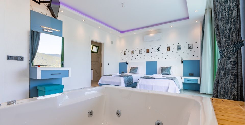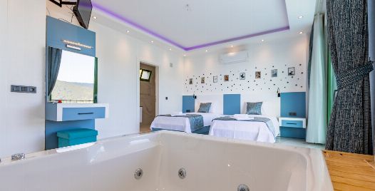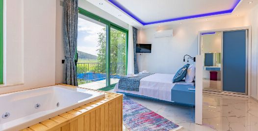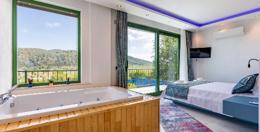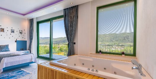 İki katlı (dubleks) yapıya sahip olan Villa Burcu, 2 yatak odasıyla 4 kişilik konaklama kapasitesi sunar. Her iki yatak odasında da jakuzi bulunmakta olup, özellikle ana yatak odasında yer alan doğa manzaralı jakuzisi, tatilinize romantik ve huzurlu bir atmosfer katar. Villamızın iç mekanında modern mimari çizgiler ve özenle seçilmiş şık eşyalar dikkat çeker.