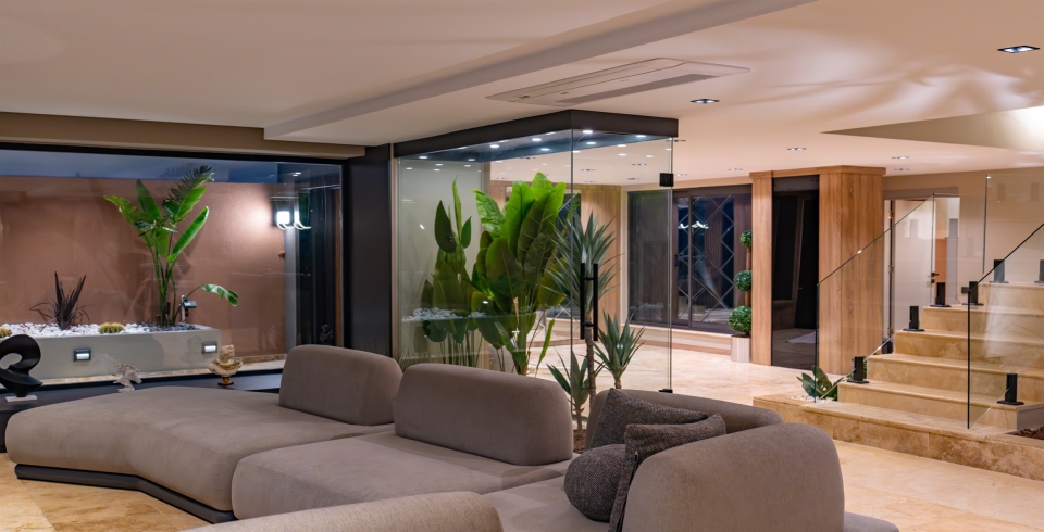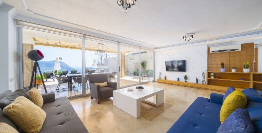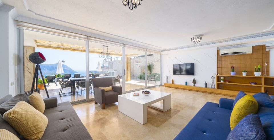 Salon : Salonda klima, uydu alıcısı, TV, DVD Player, oturma grubu, ütü ve ütü masası, lavabo yer almaktadır ve havuz kenarına çıkış vardır. Salon havuz katındadır. En üst katta dinlenmek ve güneşlenmek için çok geniş bir seyir terası daha vardır. Bu alanda da oturma grubu, masa ve sandalye bulunur.