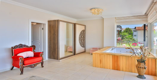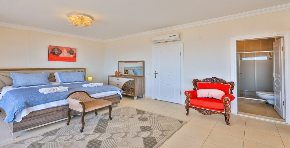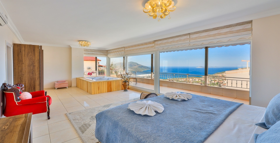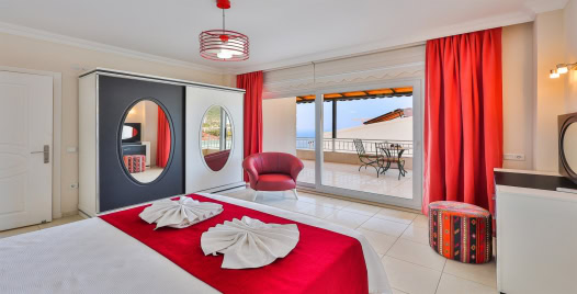 Birinci yatak odasında çift kişilik yatak, klima, elbise dolabı, özel jakuzi ve ebeveyn banyosu bulunur. İkinci yatak odasında çift kişilik yatak, klima ve özel banyo yer alırken, üçüncü yatak odası üç tek kişilik yatak, klima ve banyo ile donatılmıştır. Odaların tümü balkonlu olup Kalkan Koyu’nun büyüleyici manzarasına sahiptir.