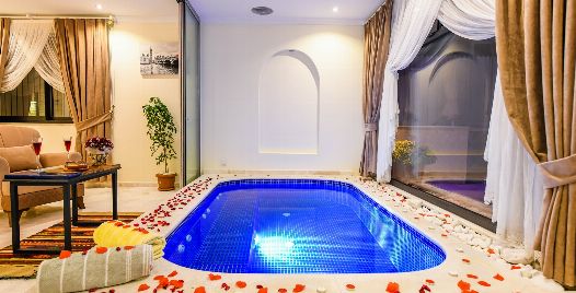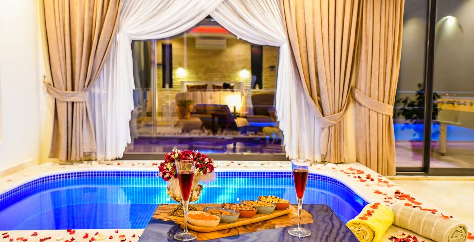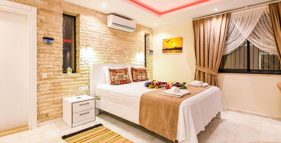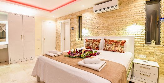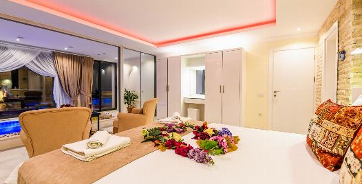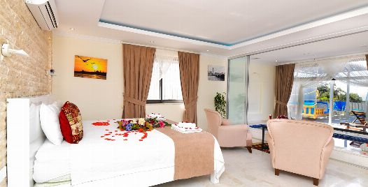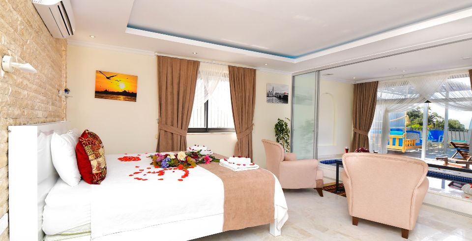 1. Yatak Odası : 1 adet çift kişilik yatak, klima, özel havuz, elbise dolabı, banyo ve lavabo bulunmaktadır.