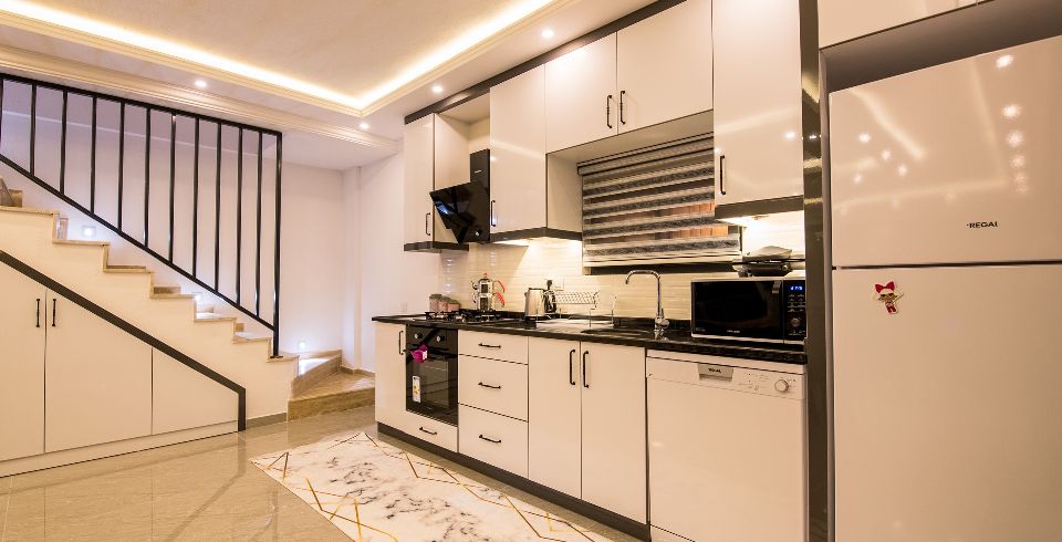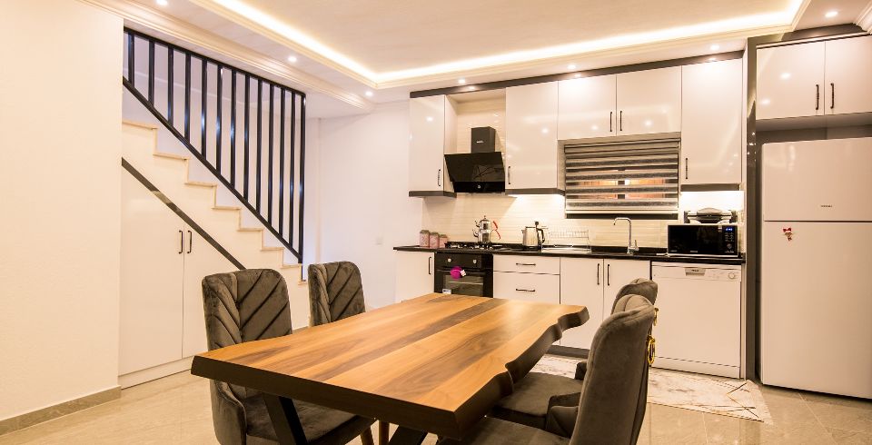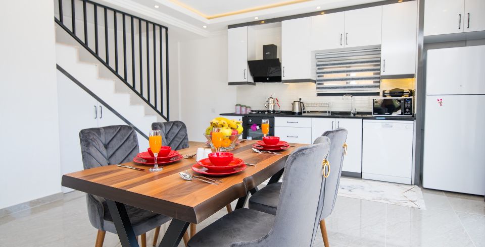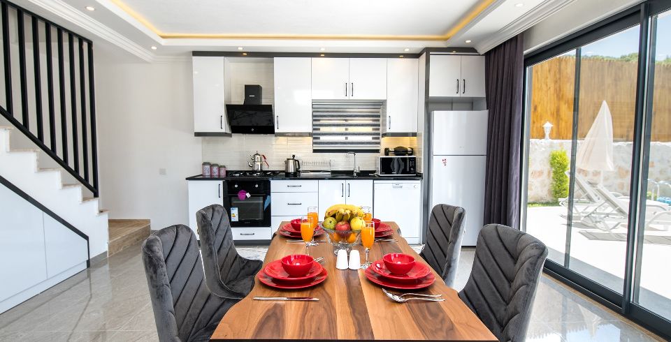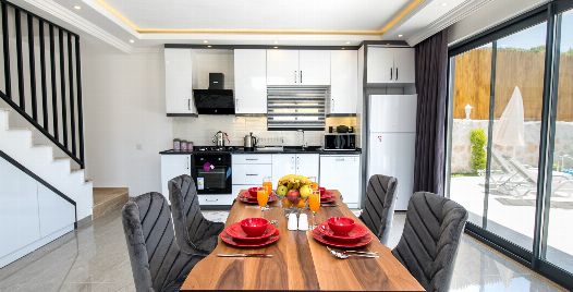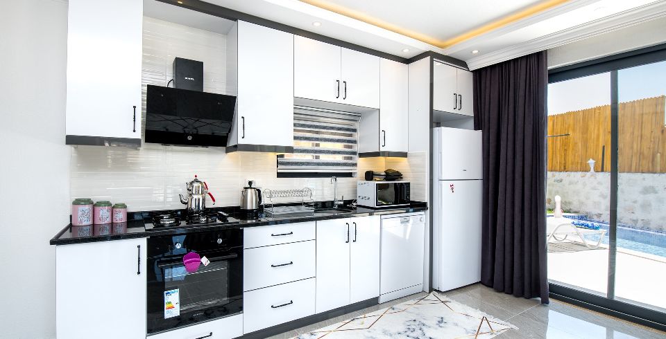 Mutfak : Villamızın mutfağında buzdolabı bulaşık makinası, çamaşır makinası, 4'lü ocak, ketıl, 4 kişilik yemek takımı bulunmaktadır.