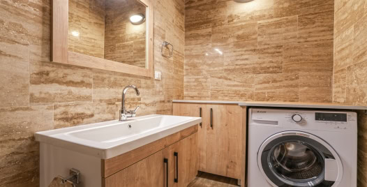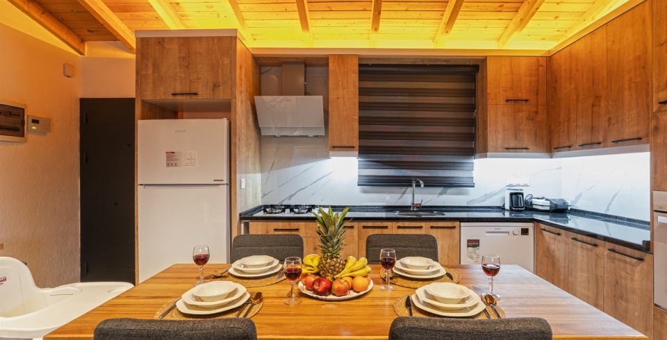 Mutfak : Modern Amerika mutfağımızda 4 kişilik yemek masası, buzdolabı, çamaşır makinesi, mikrodalga fırın, 4’lü ocak, elektrikli su ısıtıcısı, kahve makinası, çatal-bıçak takımı, tencere-tava takımı, bulaşık makinesi bulunmaktadır.