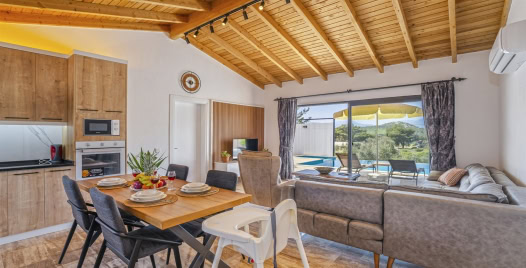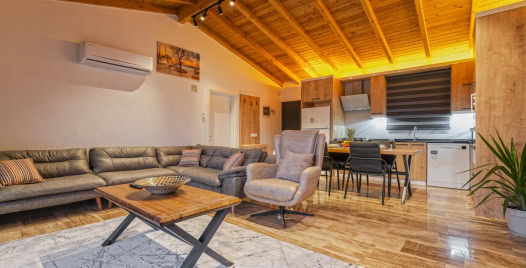 Salon : Villamızın iç dizaynı da son modaya uygun olarak modern bir şekilde tasarlanmıştır. Çeşitli dekoratif eşyalarla süslediğimiz salonumuz havuzlu bahçeye açılıyor. Villa salonunda oturma grubu, TV, internet, klima, sehpa bulunmaktadır.