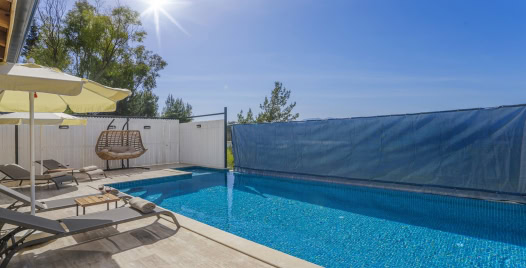 Havuz ve Bahçe : Villamız korunaklı olduğundan dışarıdan kesinlikle görünmemektedir. 1.55 metre sığ özel yüzme havuzunun içinde şezlong bulunan bahçemizde ekstra şezlonglar, şemsiye, yemek masası, salıncak bulunmaktadır.
