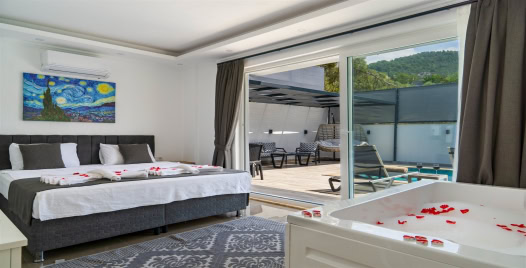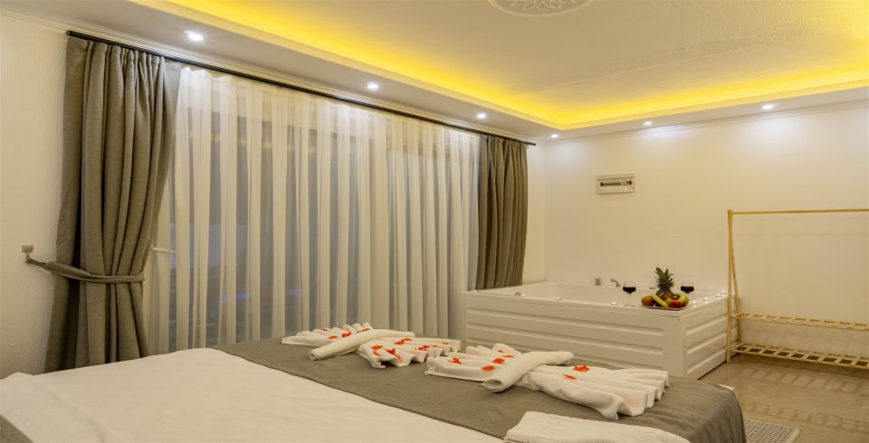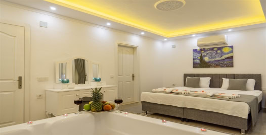 1. Yatak Odası : 1 adet çift kişilik yatak,jakuzi, klima, komodin, makyaj masası, banyo ve lavabo bulunmaktadır.
