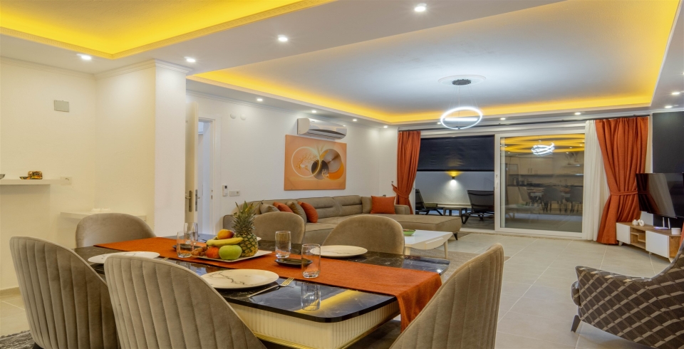 Salon : Villamızın salonunda oturma grubu, tv, internet, klima, yemek masası, sehpa bulunmaktadır.