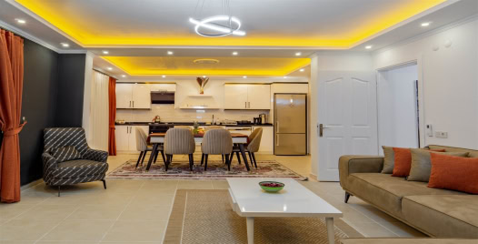 Mutfak : Modern Amerika mutfağımızda 4 kişilik yemek masası, buzdolabı, çamaşır makinesi, 4’lü ocak, tost makinesi, elektrikli su ısıtıcısı, çatal-bıçak takımı, tencere-tava takımı, bulaşık makinesi bulunmaktadır.