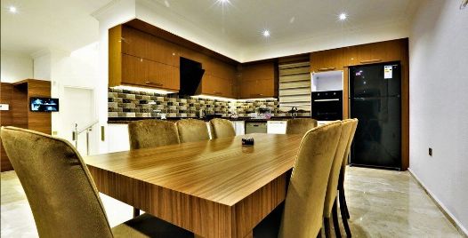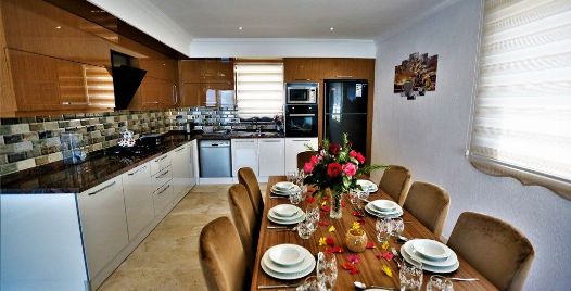 Mutfak : Modern Amerikan mutfak içerisinde buzdolabı, bulaşık makinası, fırın, ocak, mikrodalga fırın, tost makinası, yemek masası, yemek takımları, çatal ve bıçak takımları, tencere ve tava takımları, bardaklar bulunmaktadır.