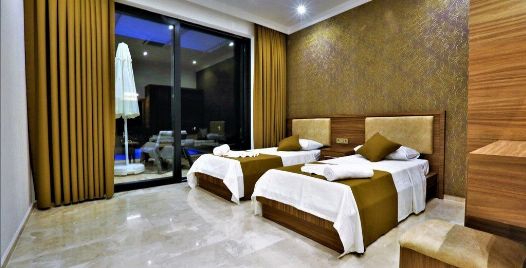 3. Yatak Odası : 2 adet tek kişilik yatak, klima, komodin, elbise dolabı, makyaj masası, balkon, banyo ve tuvalet bulunmaktadır. Havuz terasına çıkış yapılabilmektedir.