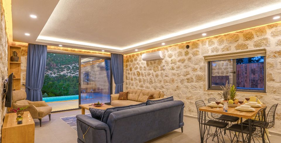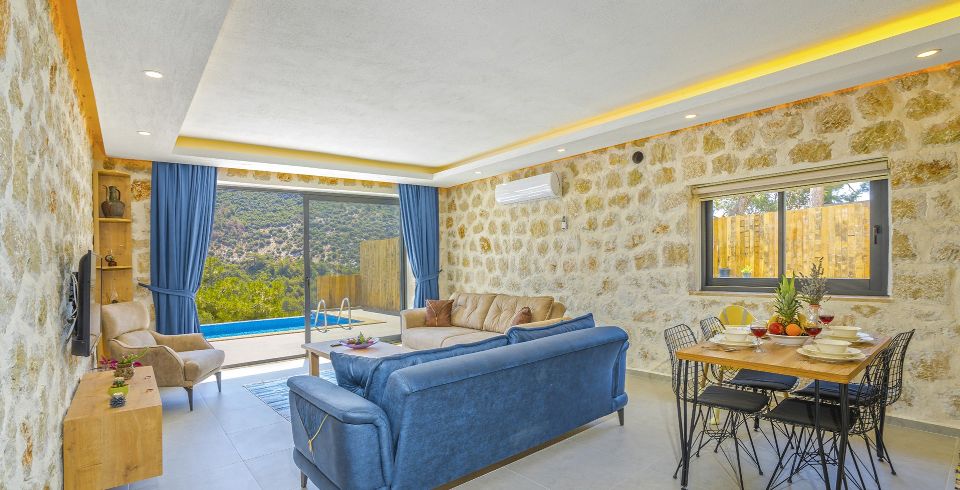 Salon : Salon içerisinde oturma grubu, TV, klima, sehpa bulunmaktadır. Havuz terasına çıkış yapılabilmektedir.