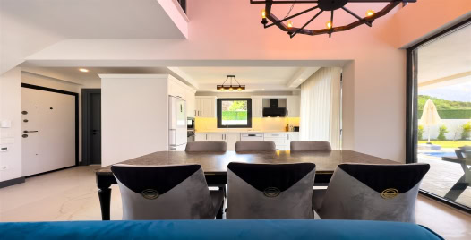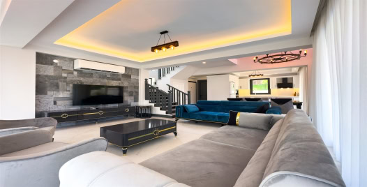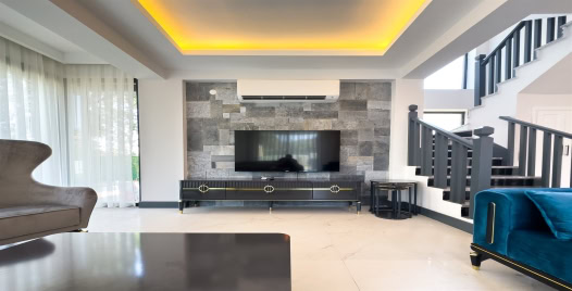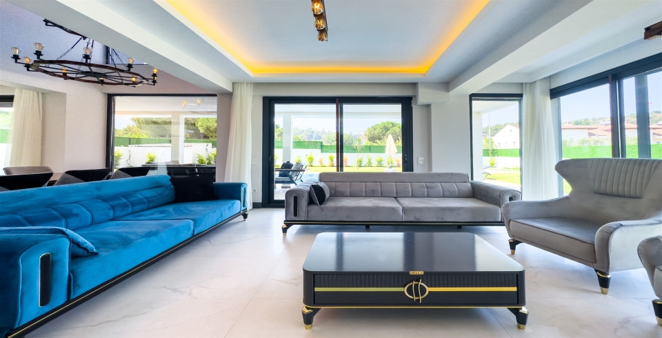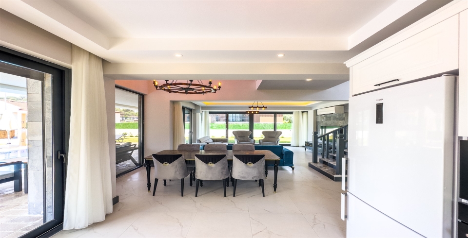 Salon: Oturma grubu, Uydu TV, 6 Kişilik yemek masası, Klima, Havuz kenarına çıkış bulunmaktadır.