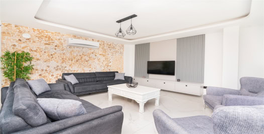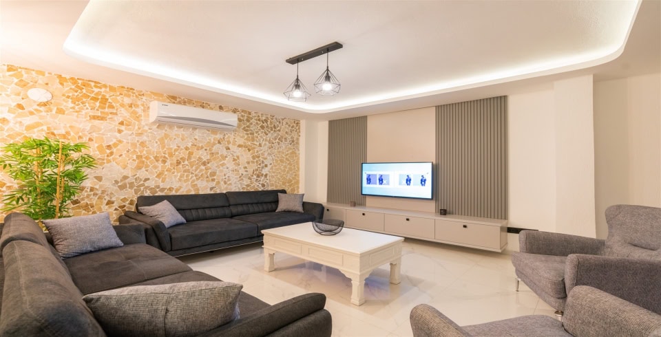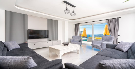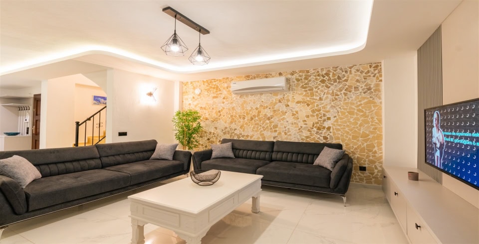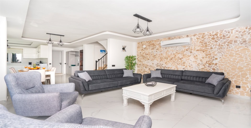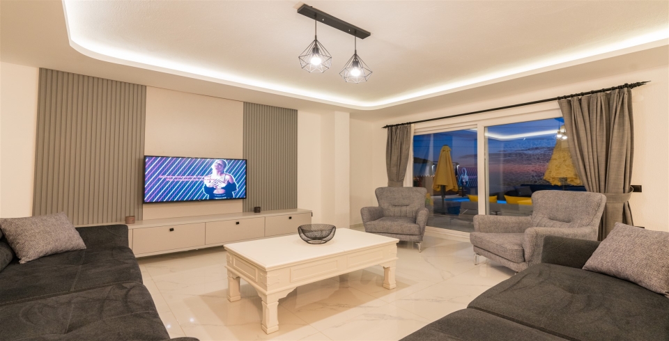 Salon : Salon içerisinde oturma grubu, TV, klima, sehpa bulunmaktadır. Havuz terasına çıkış yapılabilmektedir.