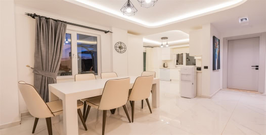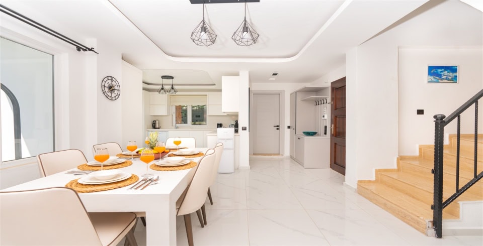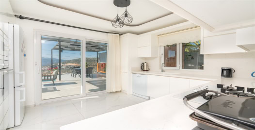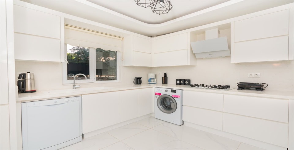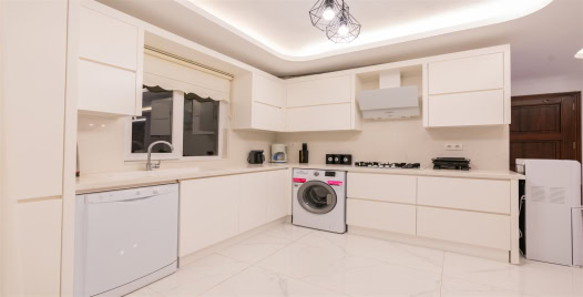 Mutfak : Modern Amerikan mutfak içerisinde 6 kişilik yemek masası, buzdolabı, bulaşık makinası, çamaşır makinesi, fırın, ocak, kahve makinesi, yemek takımları, çatal ve bıçak takımları, tencere ve tava takımları, bardaklar bulunmaktadır.