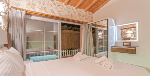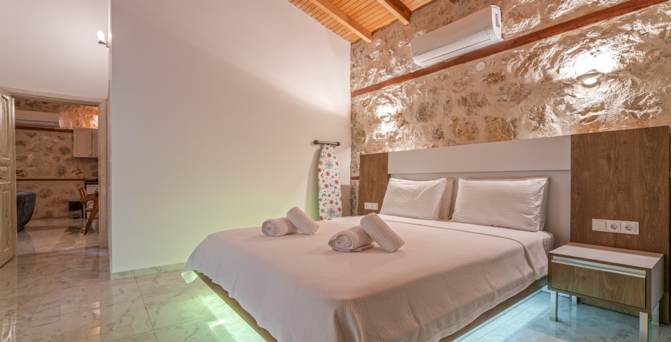 1. Yatak Odası : 1 adet çift kişilik yatak, klima, elbise dolabı, makyaj masası, komodin, banyo ve lavabo bulunmaktadır.
