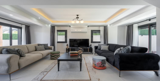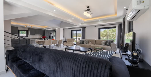 Salon: Özenle döşenmiş salon, modern koltuklar, 8 kişilik yemek masası, LCD TV ve klima bulunmaktadır.