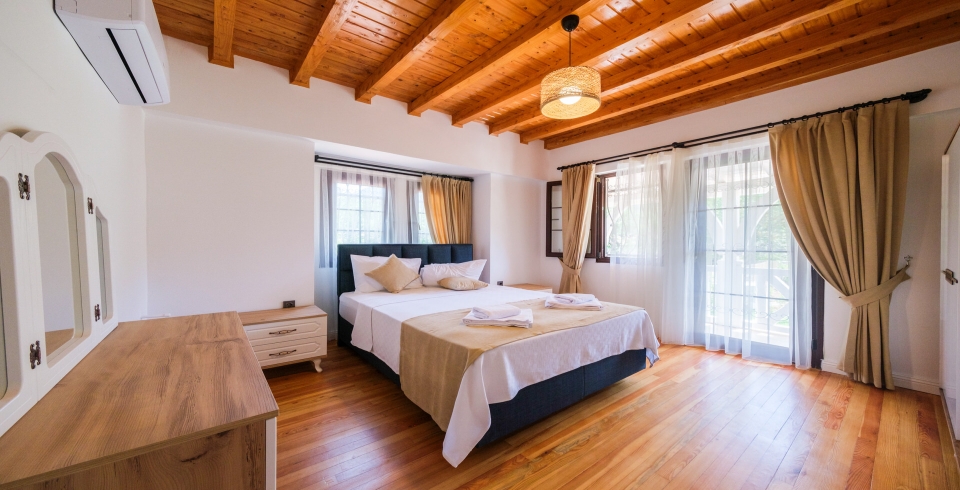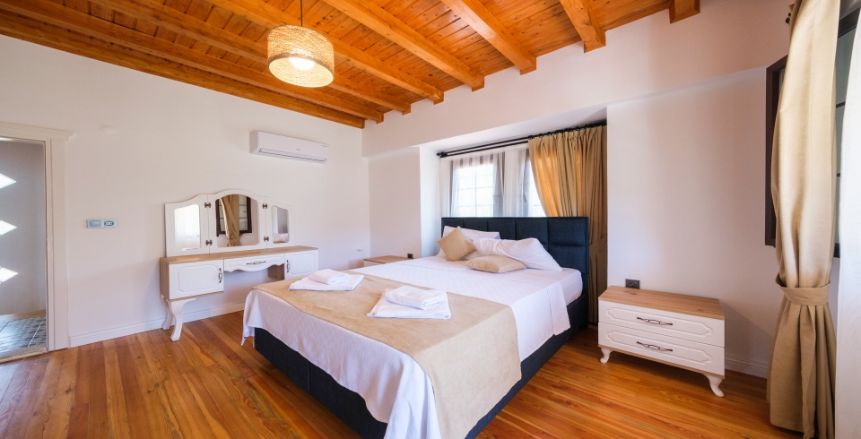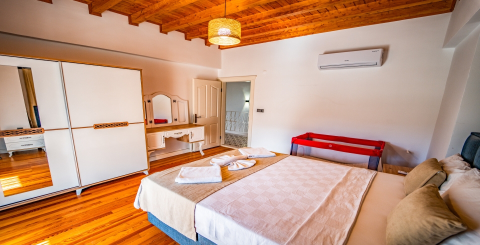 1.Yatak Odası: 1 adet çift kişilik yatak, elbise dolabı, komodin, makyaj masası, klima, banyo ve lavabo bulunmaktadır.