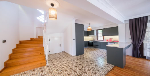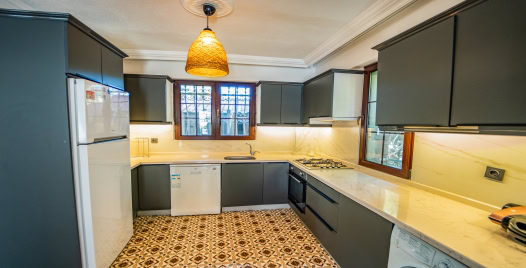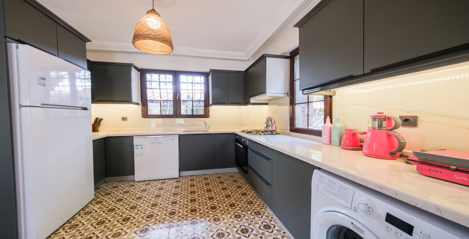 Mutfak: Açık planlı mutfak, 6 kişiye yetecek kadar mutfak malzemeleri, buzdolabı, fırın, ocak, mikrodalga fırın, bulaşık makinesi, çamaşır makinesi, tost makinesi, kettle ve çaydanlık bulunmaktadır..