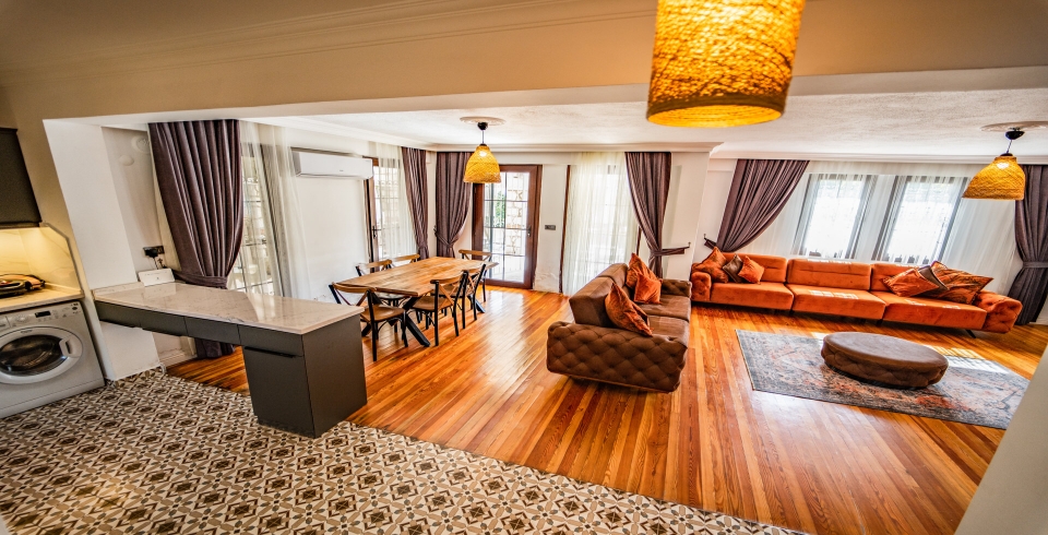 Salon: Özenle döşenmiş salon, modern koltuklar, 6 kişilik yemek masası, LCD TV ve klima bulunmaktadır.