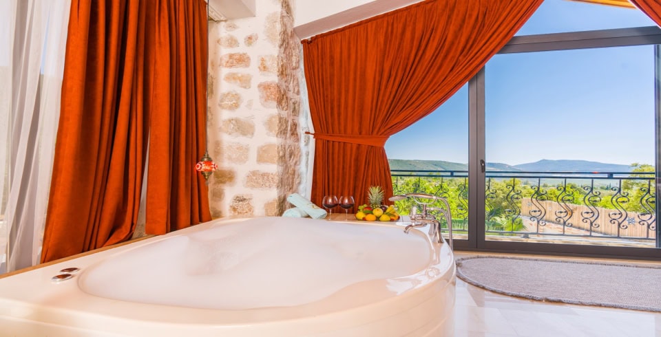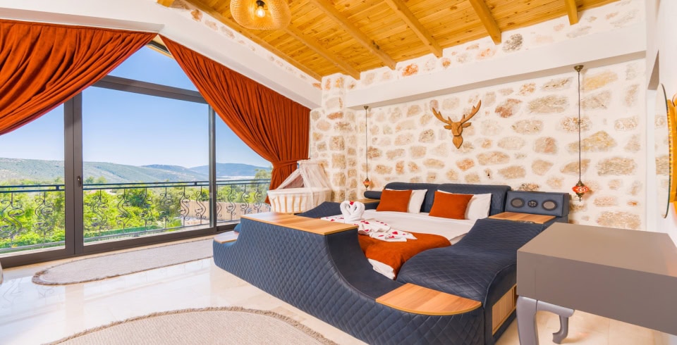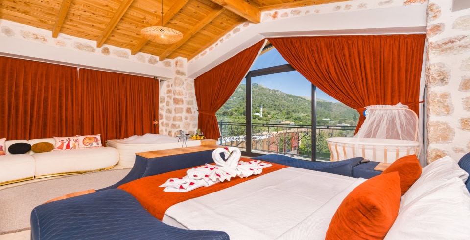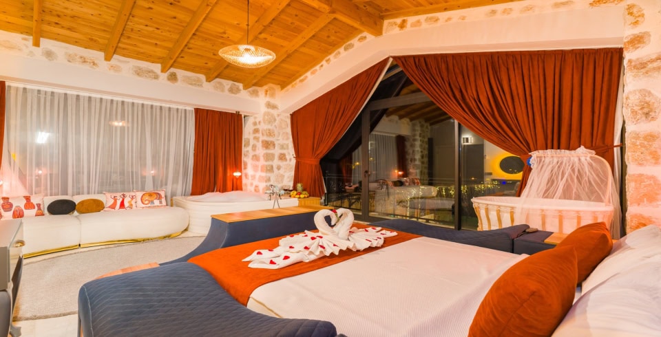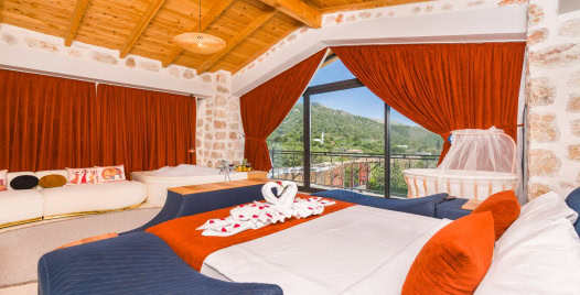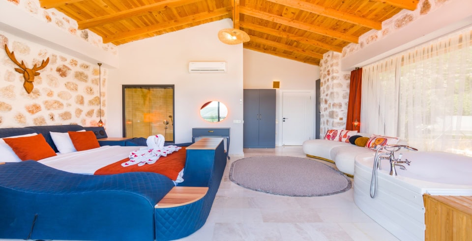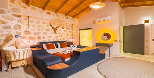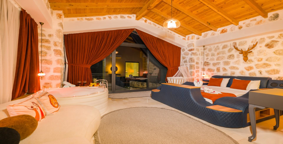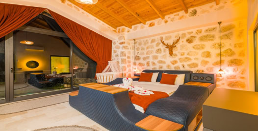 1. Yatak Odası : 1 adet çift kişilik yatak, televizyon, klima, jakuzi, komodin, masaj koltuk ,elbise dolabı, makyaj masası, banyo ve lavabo bulunmaktadır.