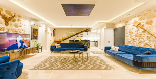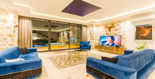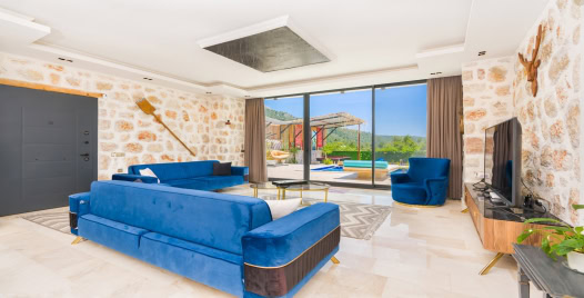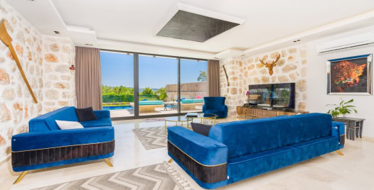 Salon : Şık bir oturma grubu ile klima, televizyon, internet, uydu, koltuk, sehpa ile ferah bir salon bulunmaktadır. Havuz terasına çıkış yapılmaktadır.