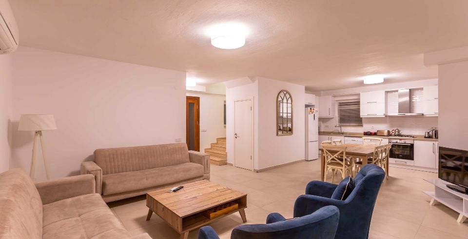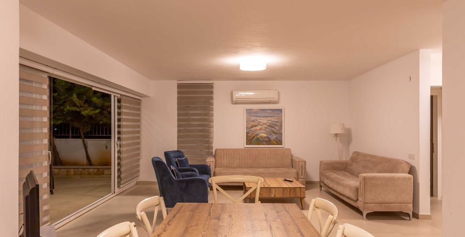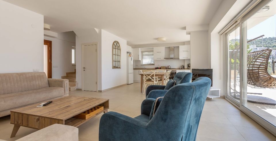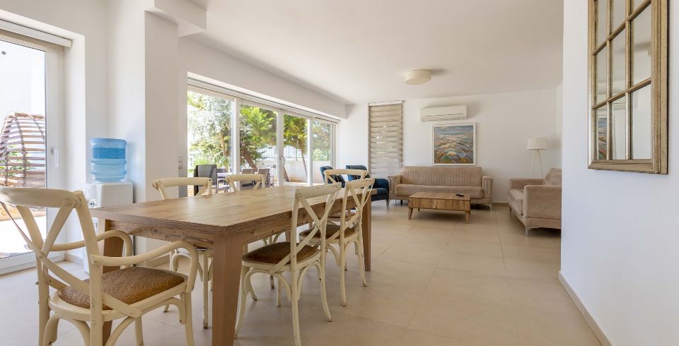 Salon: Deniz Manzaralı (Zemin Katta), Oturma Grubu, LCD Tv, 6 Kişilik yemek masası, Havuz kenarına çıkış, Banyo ve Lavabo bulunmaktadır.
