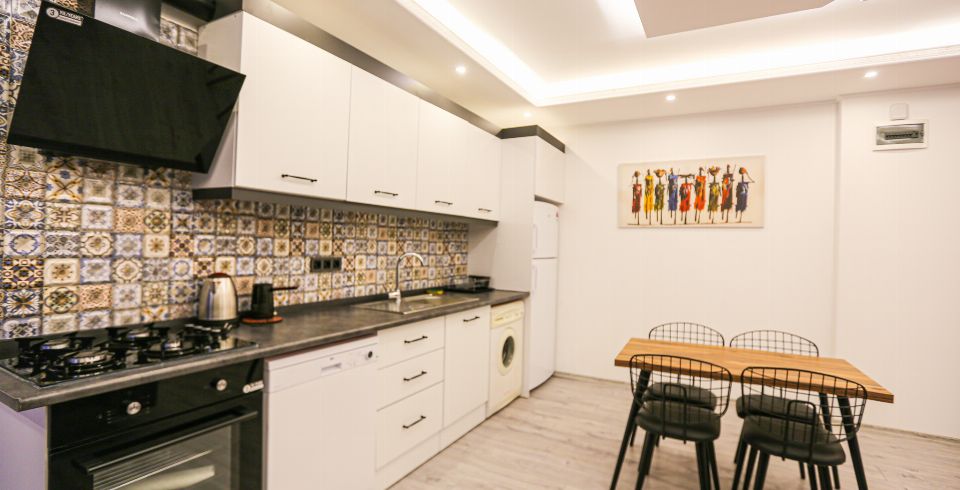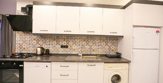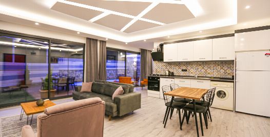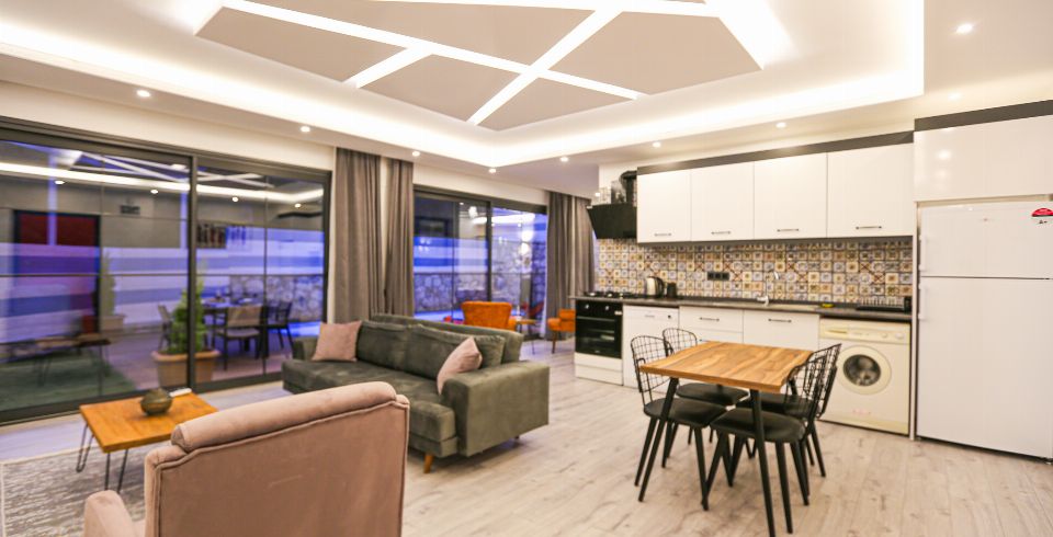 Mutfak : Villa içinde modern Amerikan mutfak bulunmaktadır. Mutfakta mikrodalga fırın, bulaşık makinası, ankastre fırın, buzdolabı, çamaşır makinası, ankastre 4’lü ocak, elektrikli su ısıtıcı kettle, tencere ve tava takımı, yemek takımı, kaşık ve çatal seti ve bardaklar bulunmaktadır. Havuz başına geçiş bulunmaktadır.
