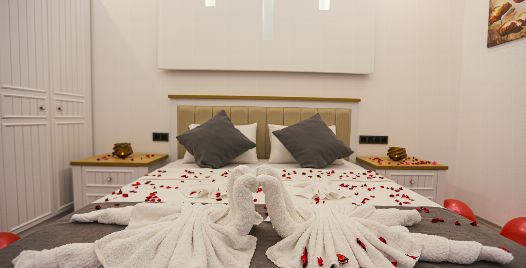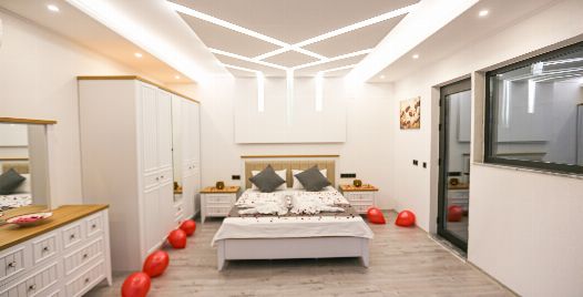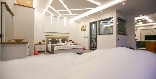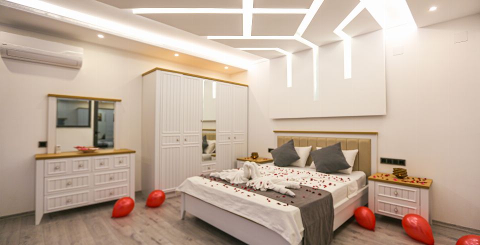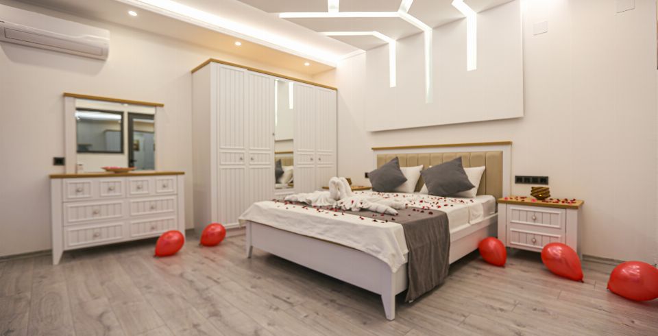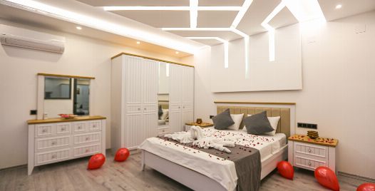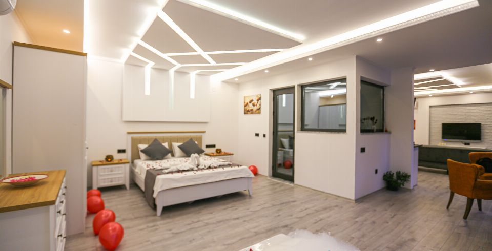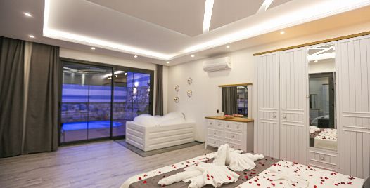 1. Yatak Odası : Suit yatak odası 1 adet çift kişilik yatak, klima, jakuzi, gardırop, komodin, yer almaktadır.