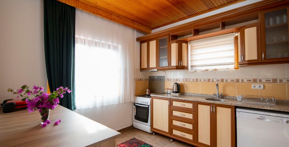 Mutfak : Villamızın geniş Amerikan mutfağı ile sizlere kendi evinizin mutfağı gibi hissettirecek. Ayrıca mutfakta klima, bulaşık makinası, buzdolabı, çamaşır makinası, mikrodalga fırın, tost makinası, ekmek kızartma, su ısıtıcısı, fırın, 4'lü ocak seti ve 6 kişilik geniş yemek masası ile tava tencere vb. mutfak araç gereçlerini kullanma fırsatını sizlere sunuyoruz.