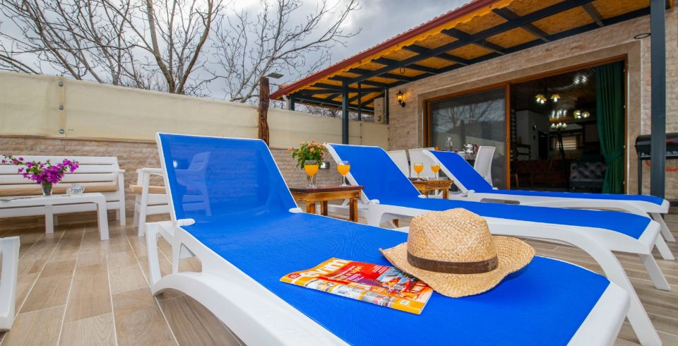 Bahçe : Villamızın bahçesinde özel yüzme havuzu, güneşlenmeniz için 5 adet şezlong, güneşlenme terası, 6 kişilik masa, oturma grubu, mangal keyfiniz için barbekü, güneş şemsiyesi bulunmaktadır.