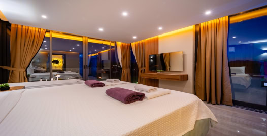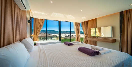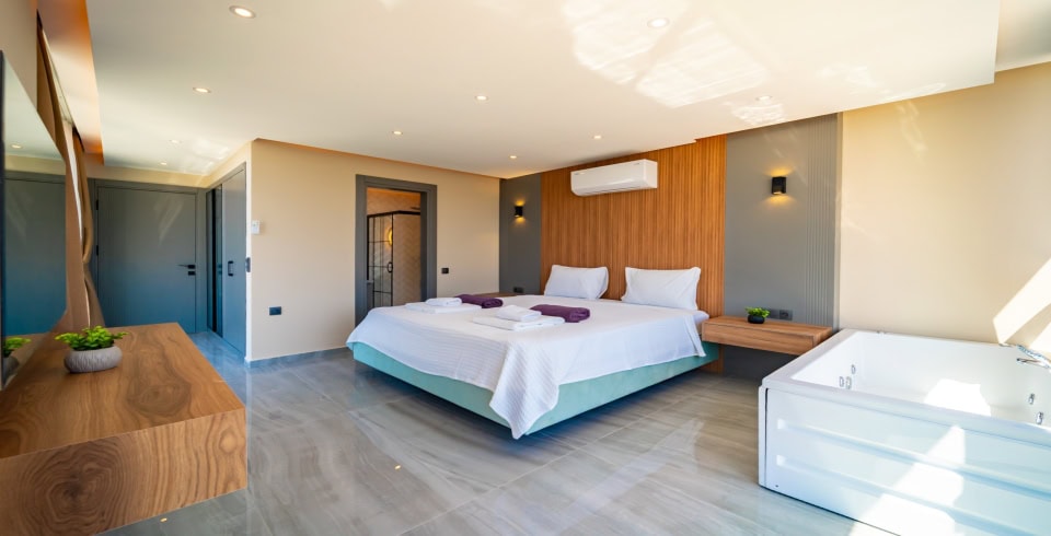 1. Yatak Odası: 1 adet çift kişilik yatak, elbise dolabı, jakuzi, makyaj masası, klima, komodin, makyaj masası, banyo ve lavabo bulunmaktadır.
