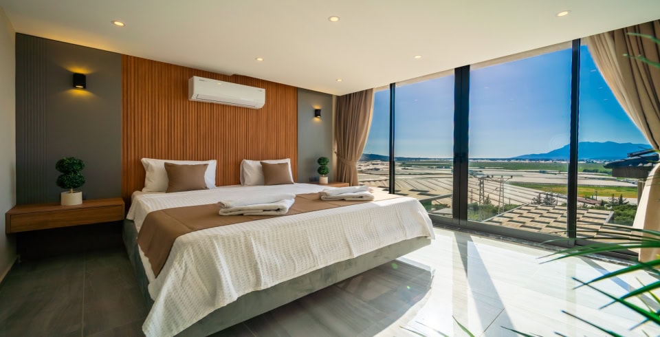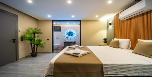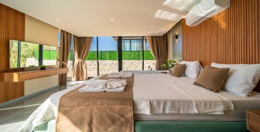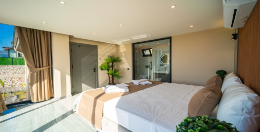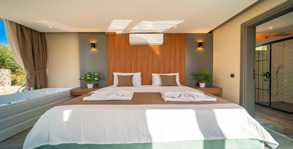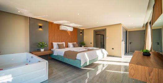 1. Yatak Odası: 1 adet çift kişilik yatak, elbise dolabı, jakuzi, makyaj masası, klima, komodin, makyaj masası, banyo ve lavabo bulunmaktadır.