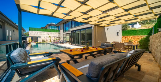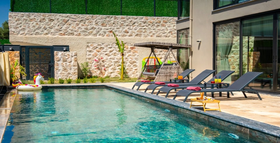 Havuz ve Bahçe: Bahçe içerisinde korunaklı özel yüzme havuzu, şezlong ve şemsiye, yemek masası ve sandalyeler, bahçe oturma grubu, salıncak, çocuk oyun alanı ve barbekü yer almaktadır.