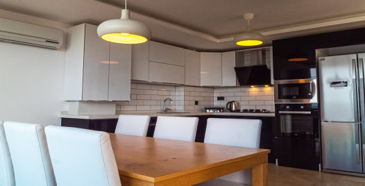 Mutfak: Buzdolabı, Bulaşık makinesi, ankastre seti, Mikrodalga fırın, su ısıtıcısı, 8 kişilik yemek takımı ve tüm mutfak gereçleri bulunmaktadır.