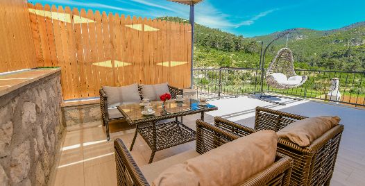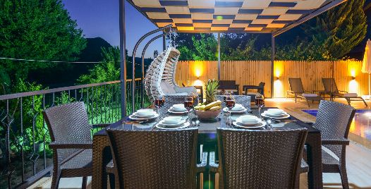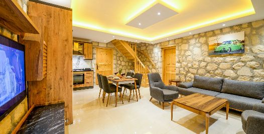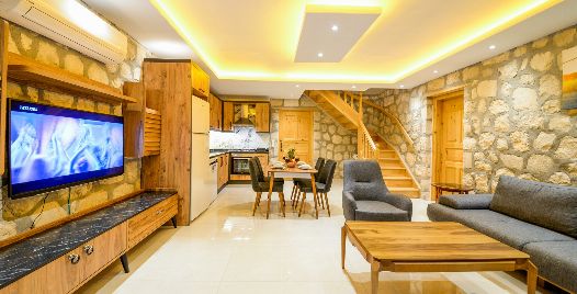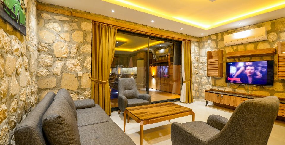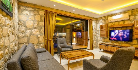 Salon : Villa Daffy salonunda konforlu oturma grubu, klima, TV, internet, uydu alıcı, yemek masası, sehpa bulunmaktadır.