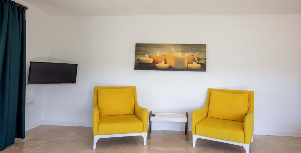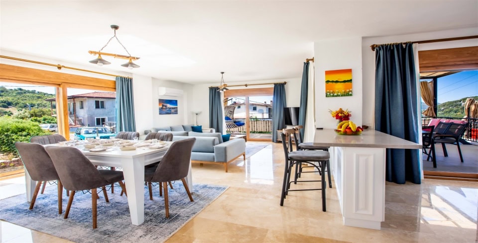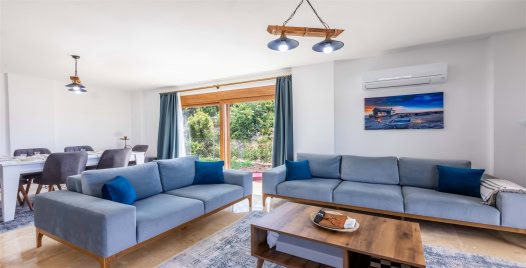 Salon : Villamızın salon kısmında; Oturma grubu, televizyon, klima, sehpa, internet ve havuz terasına çıkış bulunmaktadır.