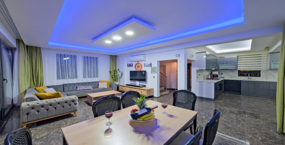 Salon: Özenle döşenmiş salon, modern koltuklar, 8 kişilik yemek masası, LCD TV ve klima bulunmaktadır.
