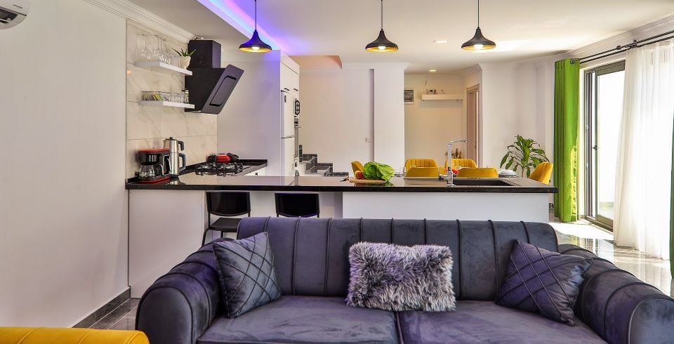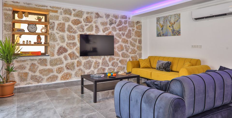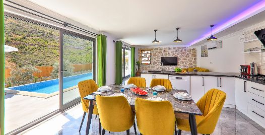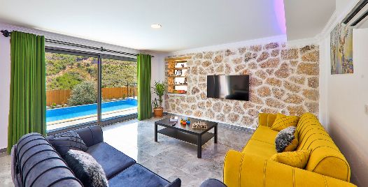 Salon: Villa salonunda konforlu oturma grubu, klima, TV, internet, uydu alıcı, yemek masası, sehpa bulunmaktadır.