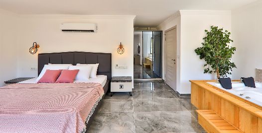2: Yatak Odası: Çift kişilik yatak, klima, jakuzi, komodin, elbise dolabı, makyaj masası, TV banyo ve tuvalet bulunmaktadır.