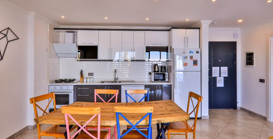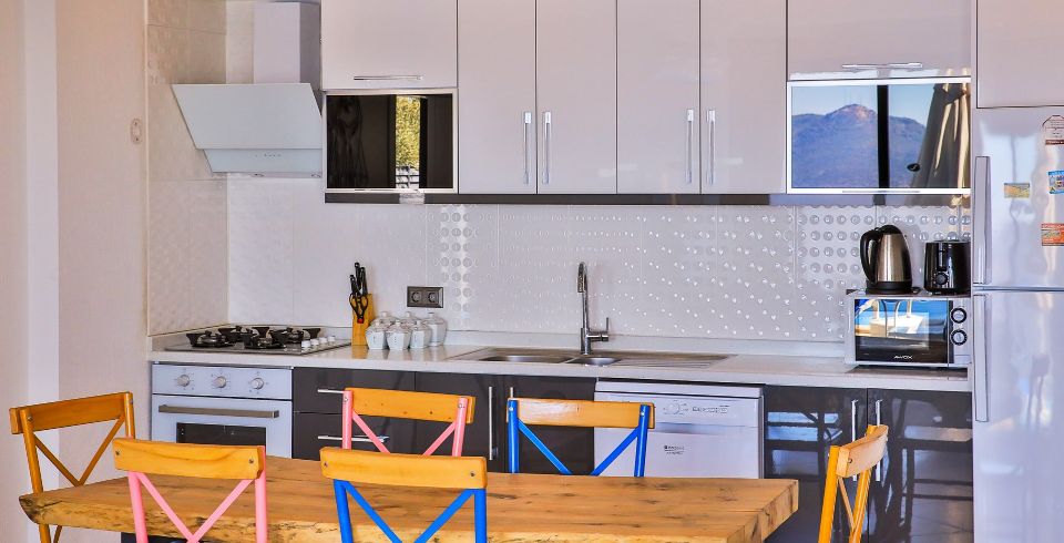 Mutfak: Amerikan açık mutfak, bulaşık makinası, buzdolabı, çamaşır makinası, , su ısıtıcısı, fırın, 4'lü ocak seti, yemek masası ve mutfak araç gerekleri 4 kişilik olarak mevcuttur.
